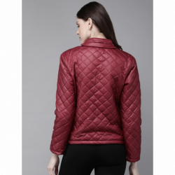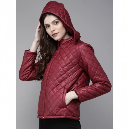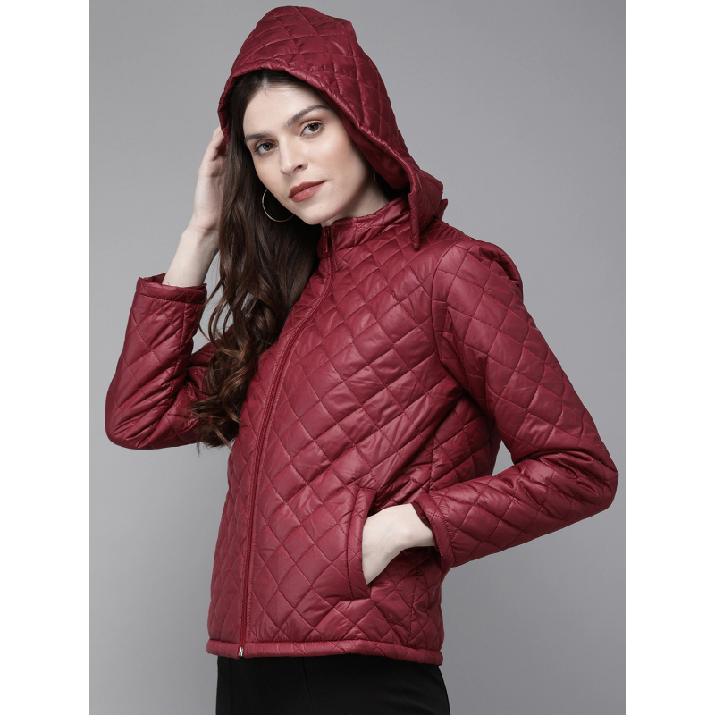 SASSAFRAS Women Maroon Solid Quilted Hooded Jacket-L