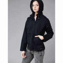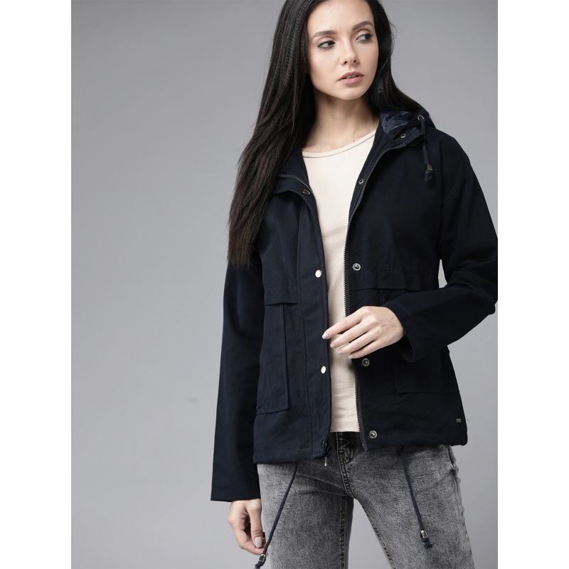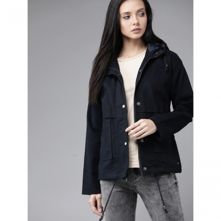 Denim Women Navy Blue Solid Hooded Jacket-M